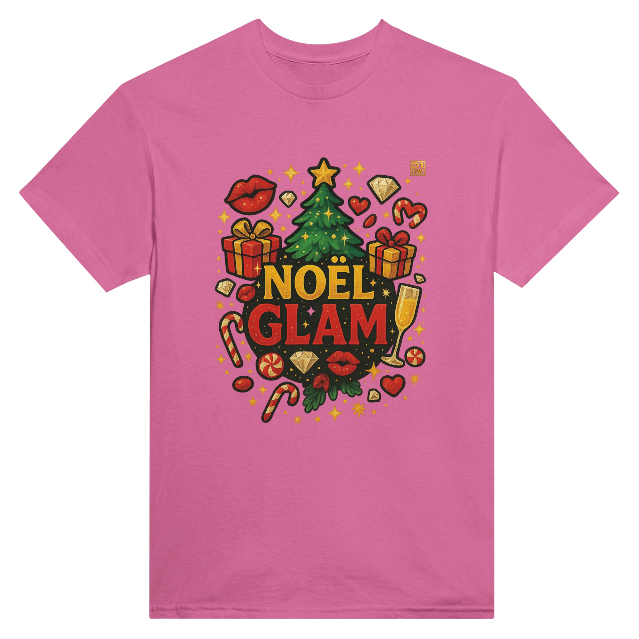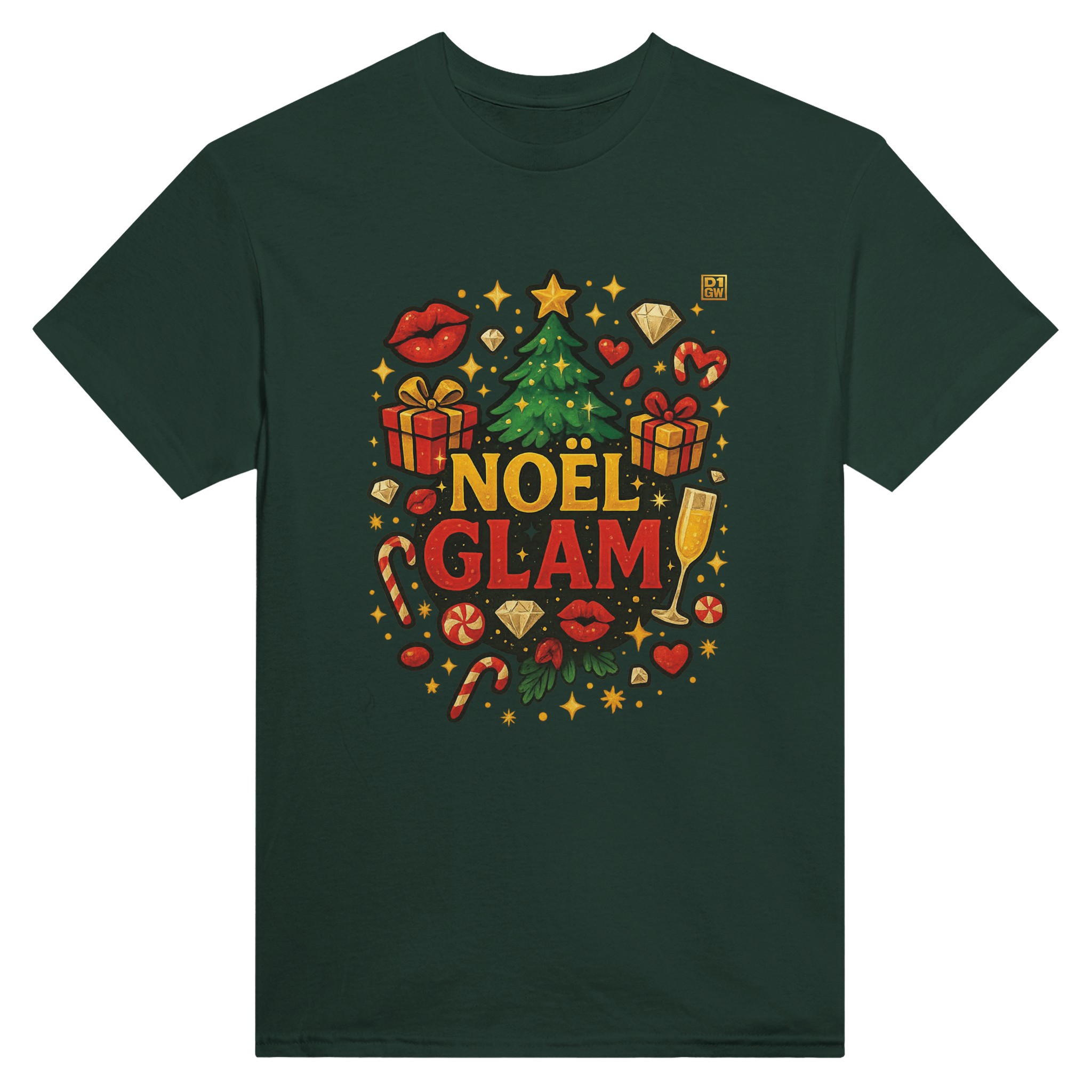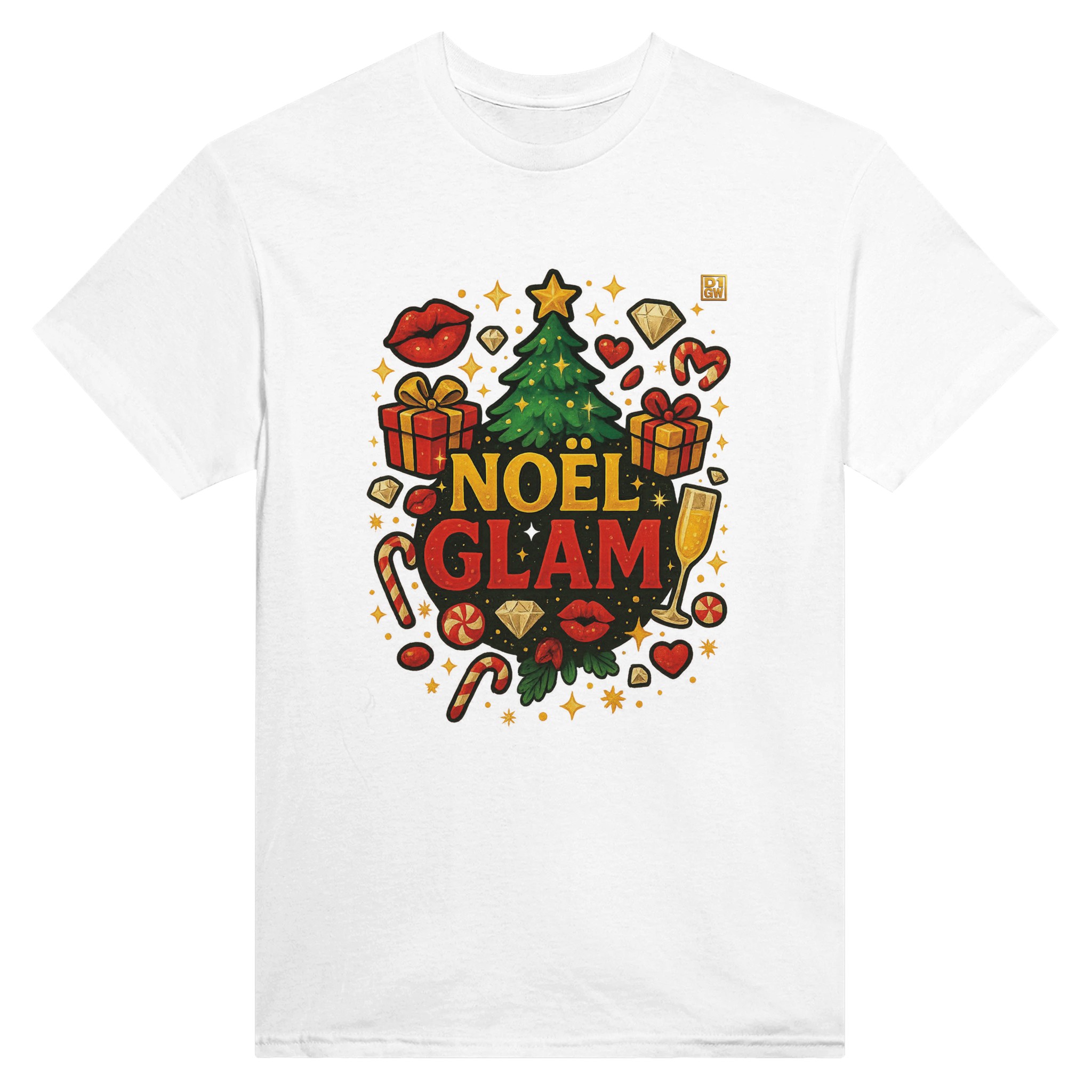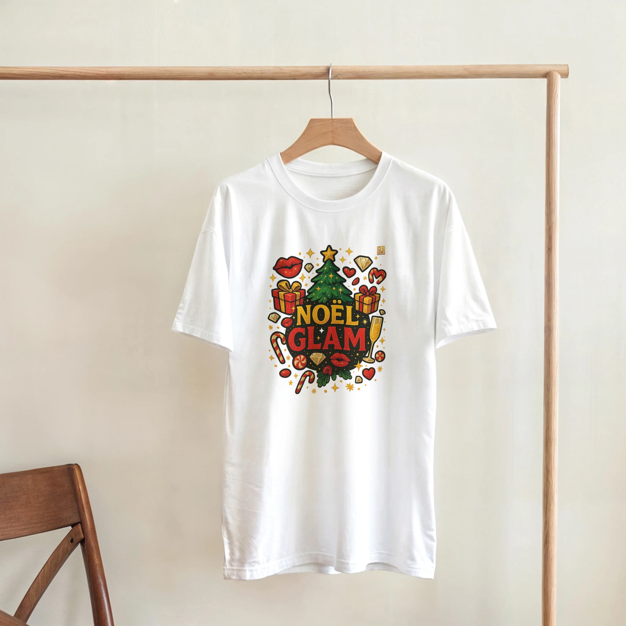 🔹 Le t-shirt affiche un logo principal à l’avant, riche en détails (paillettes, diamants, cadeaux, sapin, etc.)